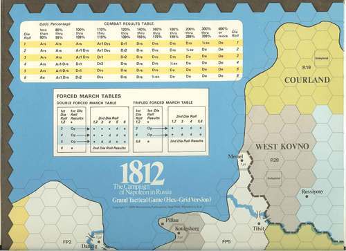 GAME DESCRIPTIONThe Components![]() Interestingly, the first thing that new players tend to notice about John Young’s design is the rather unusual look of the game map. For starters, the 22” x 34” four-color, hexagonal 1812 game map requires a separate partial map section to display part of the Baltic States and St. Petersburg, and for this reason, it requires a slightly larger table area than might otherwise be expected. Each hex is 25 kilometers from side to side. The actual geographical region depicted by the map roughly stretches from Thorn in the west, to Moscow in the east; and from St. Petersburg in the north, to Kiev in the south: an area that, in total, covers more than 1,500,000 square kilometers. What really gives the game map its distinctive appearance, however, is that the playing surface has been divided into 58 colored “Supply Areas” — roughly analogous to provinces — which play a critical role (more on this, later) in the game’s supply and attrition subroutines. Variations in types of terrain, considering the geographical scope of the game, are actually quite limited; in fact, almost all of the map’s playing area is devoted to Clear terrain hexes. Moreover, the effects on play of the few other terrain types that appear in the game are comparatively modest. All-Sea hexes and the region where the Pripet Marshes would ordinarily be displayed, for example, are off-limits to movement; unbridged River hex-sides cost one additional movement point to cross; bridged River hex-sides, on the other hand, may be crossed without penalty. Also, while I am on the subject of rivers in 1812: some players will immediately notice that the courses of many of the familiar rivers on the game map seem to have mysteriously strayed from their actual channels by dozens and even hundreds of kilometers; this isn’t a big thing so far as the play of the game is concerned, but it is a bit odd, nonetheless. In any case, only two types of terrain affect combat: River hex-sides (whether bridged or unbridged) and Fortress hexes. Units defending behind a river hex-side or within a fortress are doubled, and benefit from several other defensive advantages, as well. Interestingly, although important cities are noted on the game map they have no effect on movement or combat and, except for the single exception of Moscow, have no real effect on the play of the game. Because of the extended duration of the historical campaign, the effects of weather range from benign to severe; and the arrival of winter exerts a powerful influence on play during the last stage of the game. As evidence of this, beginning on game turn twelve (the first turn of winter), movement allowances for all units, combat or otherwise, are reduced by a single movement point. More importantly, the onset of winter also triggers very significant and onerous changes in the supply rules; and these winter-related changes, interestingly enough, penalize both the French and Russian armies equally. The game counters for the grand-tactical version of 1812 — as is typical of all of the titles in the LEIPZIG family of SPI games — are clearly printed on matté-finished cardboard and show each unit’s type, size, combat power, and movement range. Russian units are printed white on a forest green backing, while the French counters are light blue with dark blue print. Most of the infantry and cavalry pieces depict abstract, corps-sized units; with each corps counter representing approximately 25,000 men. Separate artillery counters are not included among the game’s combat units; instead, as is the case with the other titles in the LEIPZIG game series, they are considered to be factored into the organic combat power of the game’s infantry and cavalry corps. Other types of units present in the counter-mix include infantry and cavalry divisions (these are substitutes for corps-sized units reduced through forced-marching); leader units; supply trains; supply depots (French only); and assorted “area depletion” markers. The Game SystemThe movement rules in grand-tactical 1812, for those readers who are unfamiliar with the LEIPZIG Game System, are a bit unorthodox; moreover, they can also be more than a little nerve-racking. This is because players may choose, at any point during their movement phase, to increase the movement allowances of some or all of their units through the use of “forced-marches”. All units that can otherwise legally move, may, at the phasing player’s option, conduct a “double forced-march”. What this means, in game terms, is that a cavalry unit with a regular movement allowance of six movement points could potentially dash ahead expending twelve movement points instead of its regular six. This bonus, however, comes at a price: a die must be rolled for each unit attempting to forced-march; if the die-roll is successful, then the unit completes its march with no ill effects; if the attempt is unsuccessful, however, the unit may either have to abandon its forced-march attempt, or risk ending its move either disrupted or, if it is an infantry or cavalry corps, reduced to a weaker “division-sized” unit. Even worse is the fact that any non corps-sized units (that is: divisions, leaders, or supply trains) would, in such an instance, be completely eliminated and removed from the map. In addition to double forced marches, any infantry-type unit (only) may attempt a “triple forced-march; which means that an infantry corps can, with a good die roll, catapult itself forward fifteen hexes rather than its usual five. Not surprisingly, both the risks and the rewards associated with triple forced-marches are greater than for double forced-marches. That being said, forced-marches are, even if rarely employed, an important element in the game.The Zone of Control (ZOC) rules for grand-tactical 1812 will immediately be familiar to anyone who has played any of the other titles in the LEIPZIG series. All combat units 